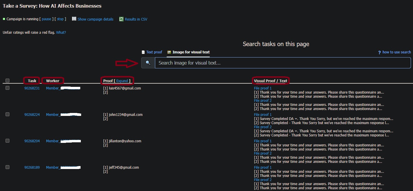 For campaigns that include file proofs, the feature goes a step further. Employers can also search by “visual text” which refers to text extracted from workers’ uploaded screenshots or image proofs. This means that even if proof is in image form, its visible text can still be detected and searched. A powerful addition for campaigns that rely heavily on screenshot submissions.