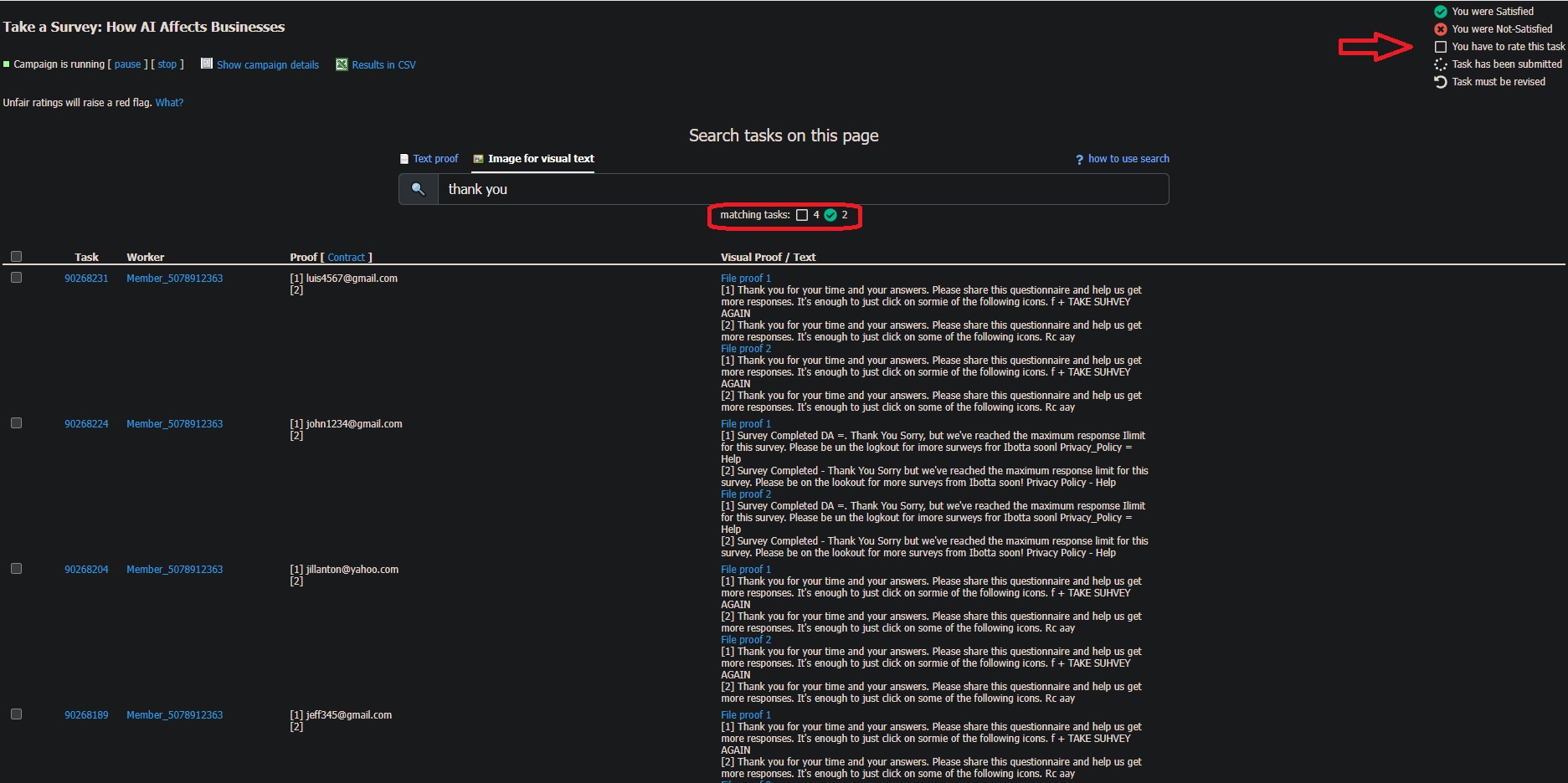 To easily check if the submitted image is correct, you can choose to type “thank you” in the search bar for visual text. The system instantly scans all image proofs and displays only those that include that phrase. The search results will also show the number of matching tasks, allowing the Employer to quickly confirm which submissions meet the campaign’s requirements. On the right side of the page, a legend is displayed to help Employers easily identify the meaning of each icon. It indicates whether a task was marked Satisfied, Not Satisfied, Needs to be Rated, Task has been submitted, or Must Be Revised. This makes the review process faster and more organized.