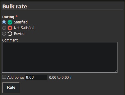 Once the correct submissions are identified, the Employer can scroll down to the Bulk Rate section at the bottom of the page. From there, tasks can be rated as Satisfied, Not Satisfied, or Revise, with the option to add comments or bonuses. With the smooth integration of search and rating tools, Employers can review and evaluate multiple tasks within the Standard platform more quickly and efficiently.