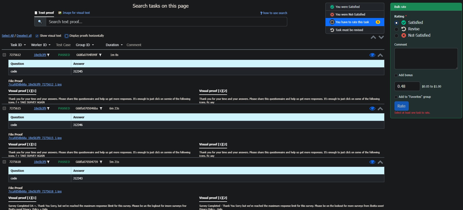 Each task line also includes the Task ID, Worker ID, Text proof and a link to view the Visual proof.